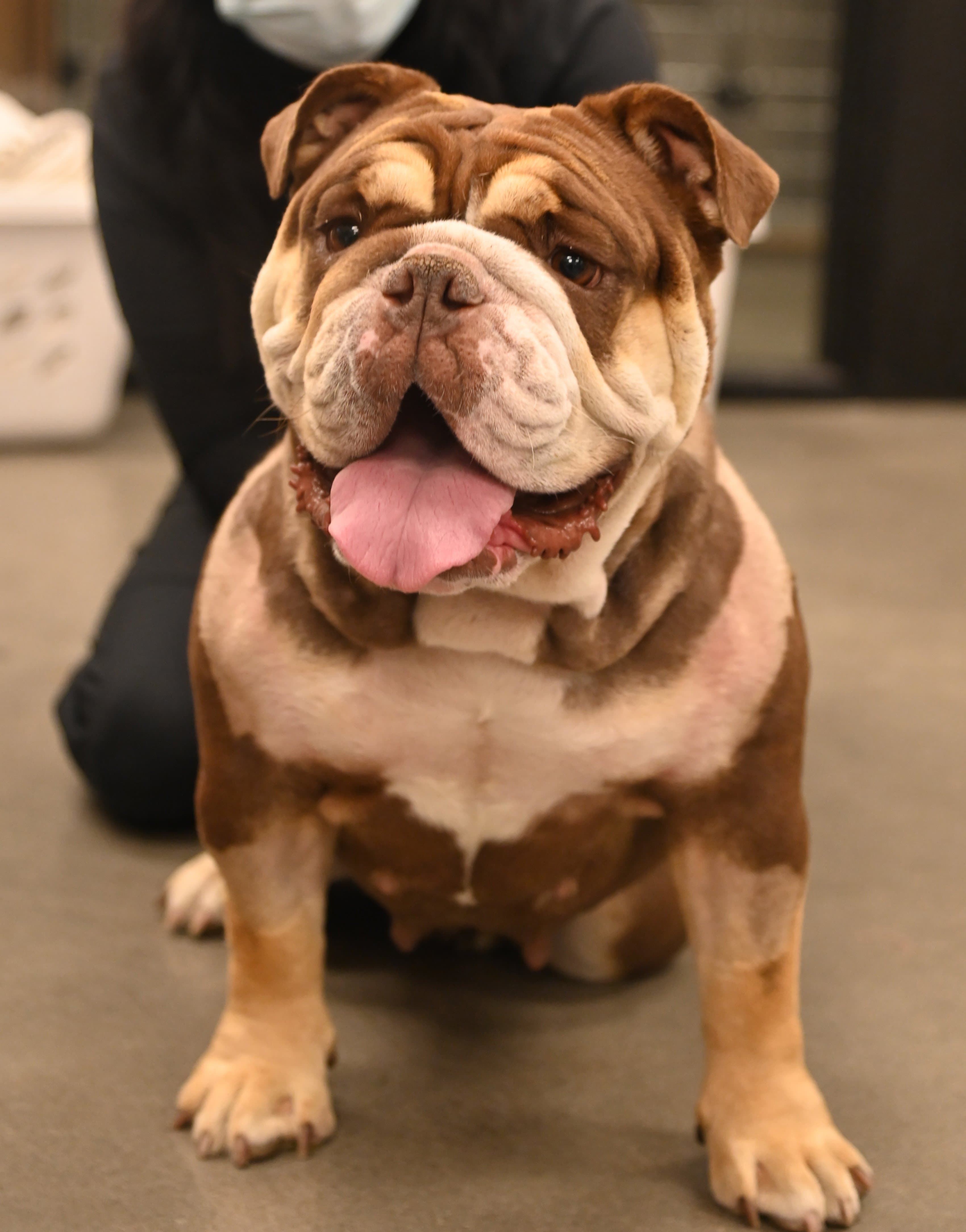 We met Petunia earlier this year under the direst of circumstances. The two and a half year old Bulldog had been rushed to the Center’s Companion Animal Hospital after a concerned member of her community found her outside with a massive cut in her neck. The wound carved its way around the entire underside of Petunia’s throat, nearly decapitating her. To make matters worse, the entire laceration was infected with maggots. Because of charitable gifts from the community, Helen Woodward Animal Center’s veterinary team was able to jump into action and treat the gravely injured dog. Center Veterinarian Dr. Olivia Garvey determined the wound was caused by a surgical cone being left on for far too long. The Veterinarian called Petunia’s injury one of the worst situations she’d seen in her career.